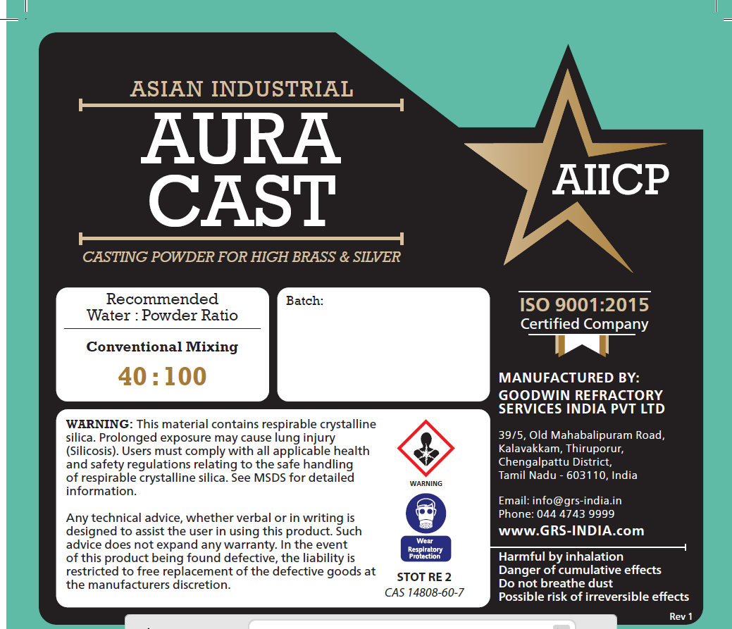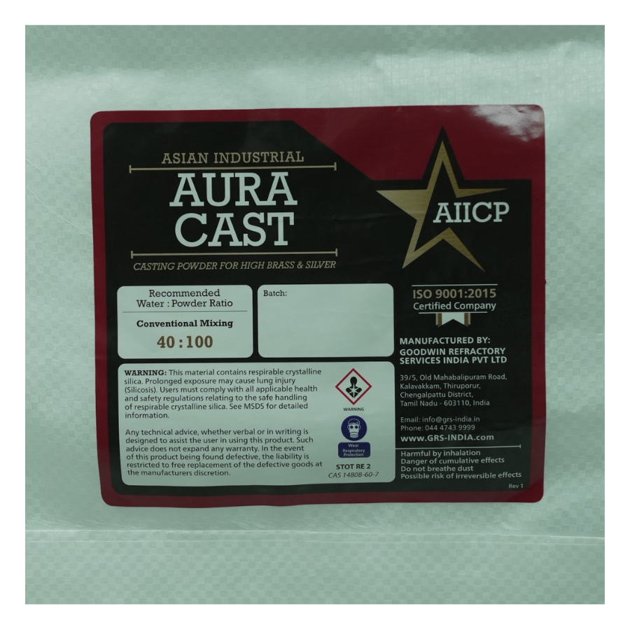 This product is "ASIAN INDUSTRIAL AURA CAST", a Casting Powder for High Brass & Silver. The recommended Conventional Mixing Water:Powder Ratio is 40:100.