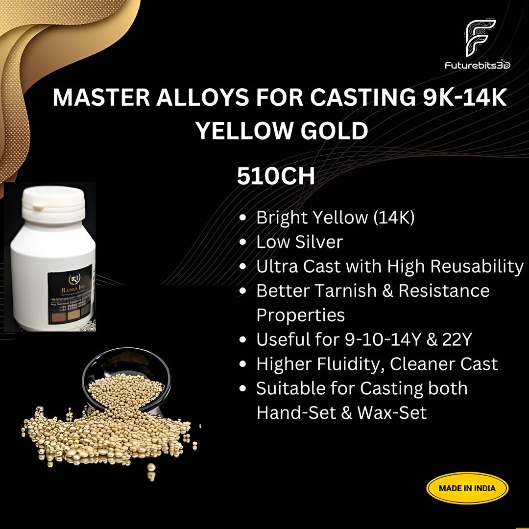 The 510CH Master Alloy is specifically designed for high-quality investment casting of 9K to 14K yellow gold jewelry, producing a bright yellow (14K) color.