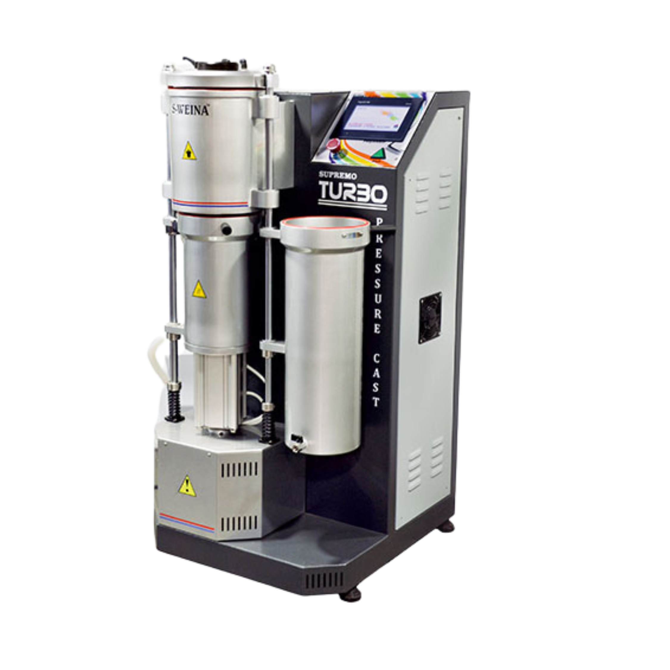 The Supremo Turbo Pressure Cast Machine is a high-performance, advanced vacuum-pressure casting unit primarily utilized in the jewelry manufacturing industry. Its main purpose is to produce high-quality, dense, and defect-free metal castings, particularly for intricate jewelry pieces using precious metals like gold, silver, and platinum. It operates by induction melting the metal within a protective vacuum or inert gas atmosphere to prevent oxidation and porosity. The machine employs a unique "Turbo Pressure" casting system, where a strong, instantaneous burst of pressure forces the molten metal into the investment mold while a high-level vacuum simultaneously pulls the metal through. This differential pressure mechanism ensures perfect filling of even the most complex filigree and thin-walled patterns, resulting in castings with superior detail, excellent surface finish, and maximized metal density.